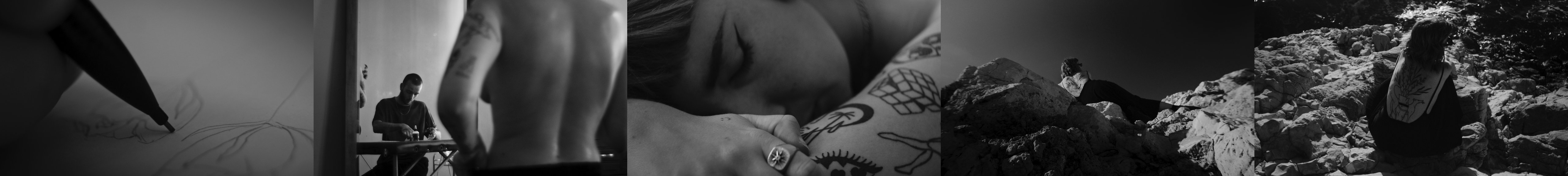 Il nous accueille pendant deux jours dans un grand appartement où plantes, tapis et miroirs se superposent. L’intimité du lieu est suffisante pour laisser pleinement la place au tatoueur et à la tatouée. Une communication silencieuse avec Emma, réalisatrice, permet l’émergence de scènes sincères et douces. Depuis la table à dessin, nous avons la chance de suivre chaque étape de la création du tatouage, mais il était important pour nous de conclure par une séquence d’exposition au monde, une errance dans un extérieur vaste et intemporel. Les calanques de Marseille étaient le décor idéal pour faire ressentir le voyage auquel ce tatouage était destiné.
