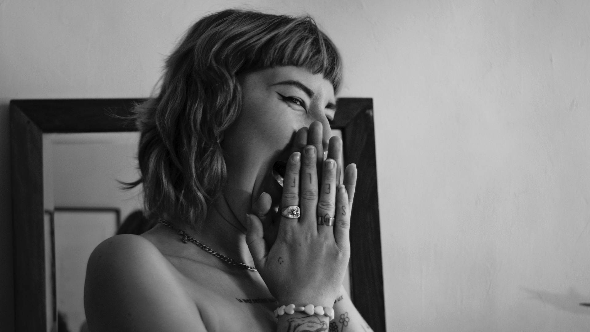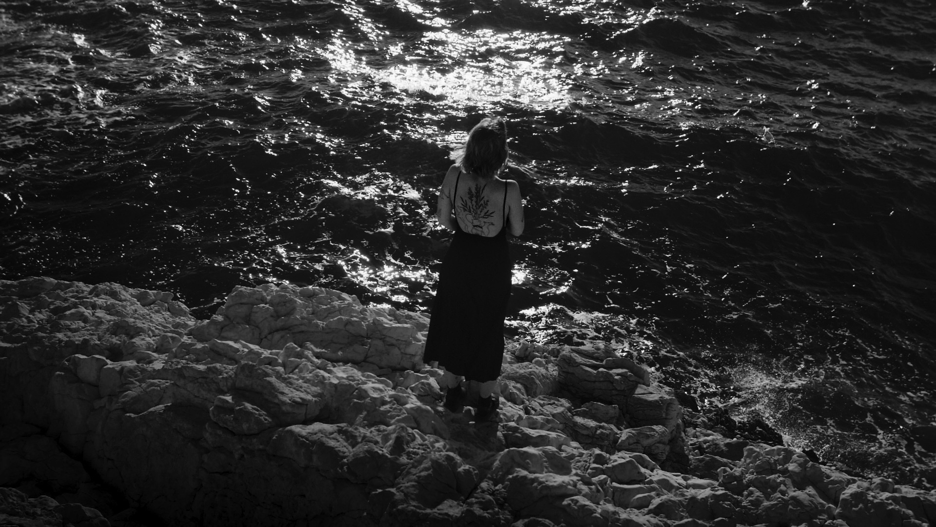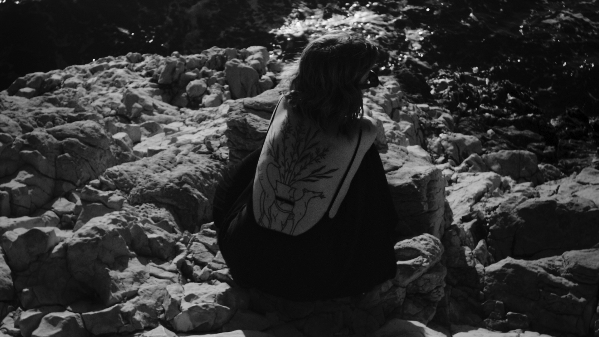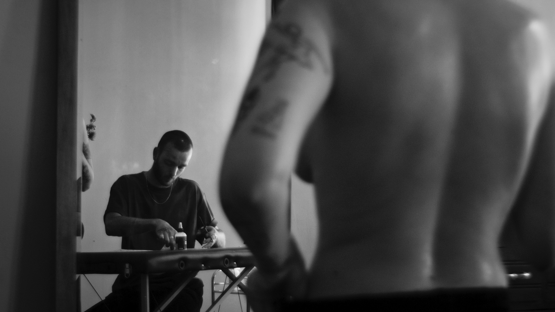 Il nous accueille pendant deux jours dans un grand appartement où plantes, tapis et miroirs se superposent. L’intimité du lieu est suffisante pour laisser pleinement la place au tatoueur et à la tatouée. Une communication silencieuse avec Emma, réalisatrice, permet l’émergence de scènes sincères et douces. Depuis la table à dessin, nous avons la chance de suivre chaque étape de la création du tatouage, mais il était important pour nous de conclure par une séquence d’exposition au monde, une errance dans un extérieur vaste et intemporel. Les calanques de Marseille étaient le décor idéal pour faire ressentir le voyage auquel ce tatouage était destiné.