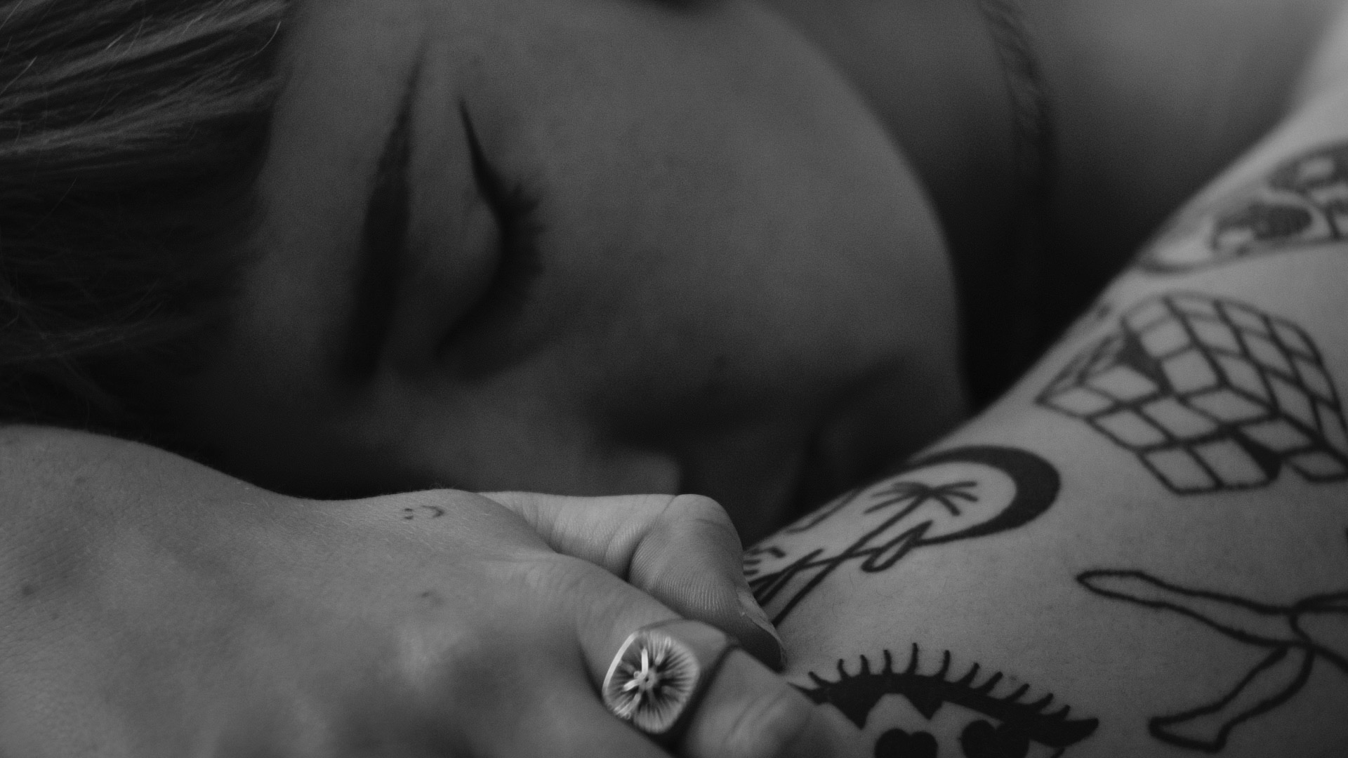 Le noir et blanc s’est imposé comme une évidence pour ce projet. D’abord parce que Flinart a toujours pris plaisir à photographier ses tatouages ainsi, et qu’il était important de s’inscrire dans son langage visuel. Ensuite, la brillance et la densité qui en résulte était la meilleure manière de rendre le trait fin, minutieux et profondément noir du tatouage, Flinart utilise très peu la couleur.
